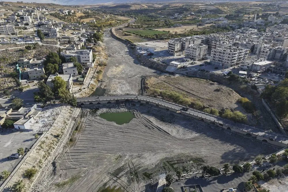 A drone view shows the dried up Orontes River in Jisr al-Shughour, west of Idlib, Syria, on Aug. 14, 2025. (AP)