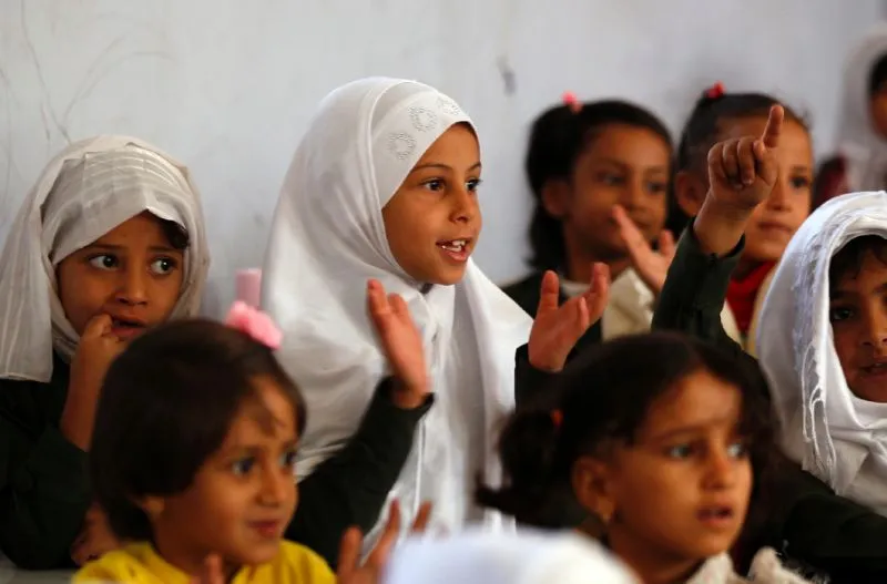 Yemeni students attend a class on the first day of the new school year in the capital Sanaa, on October 15, 2017 (AFP Photo/Mohammed HUWAIS)