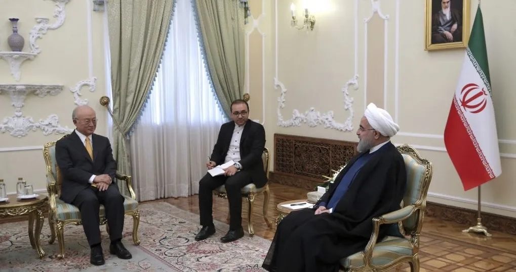 In this photo released by the office of the Iranian Presidency, President Hassan Rouhani, right, speaks with Director General of the International Atomic Energy Agency, IAEA, Yukiya Amano, left, during their meeting, in Tehran, Iran, Oct. 29, 2017. AP
