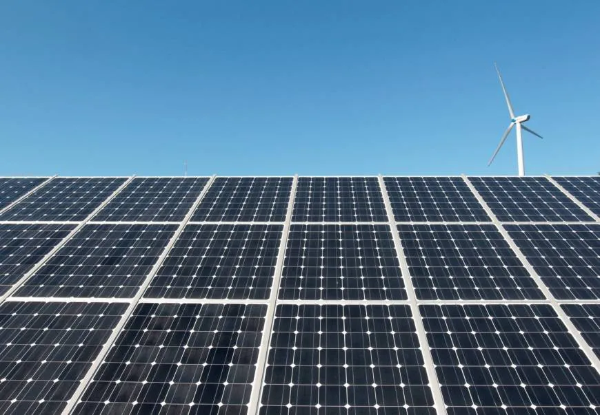 A wind turbine is seen over the panels of a solar power plant that belongs to Korea South East Power Co. in Incheon in this file photo. REUTERS