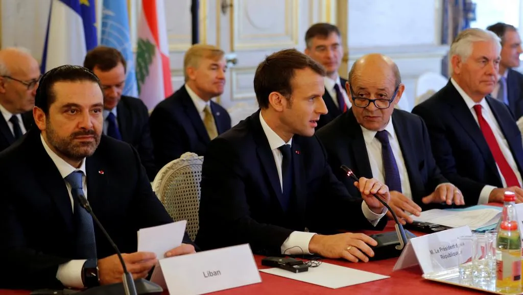 Lebanese Prime Minister Saad Hariri and French President Emmanuel Macron at the International Support Group for Lebanon meeting in Paris, France, on 8 December, 2017. (Reuters/Philippe Wojazer)