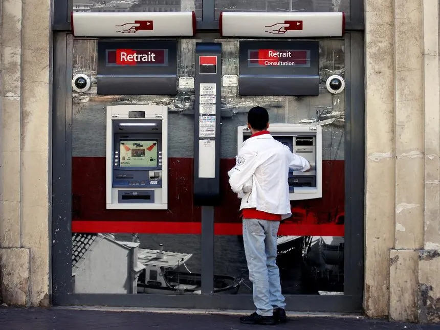 A customer withdraws money from an ATM at a Societe Generale bank branch in Marseille, France, September 4, 2017. REUTERS/Jean-Paul Pelissier