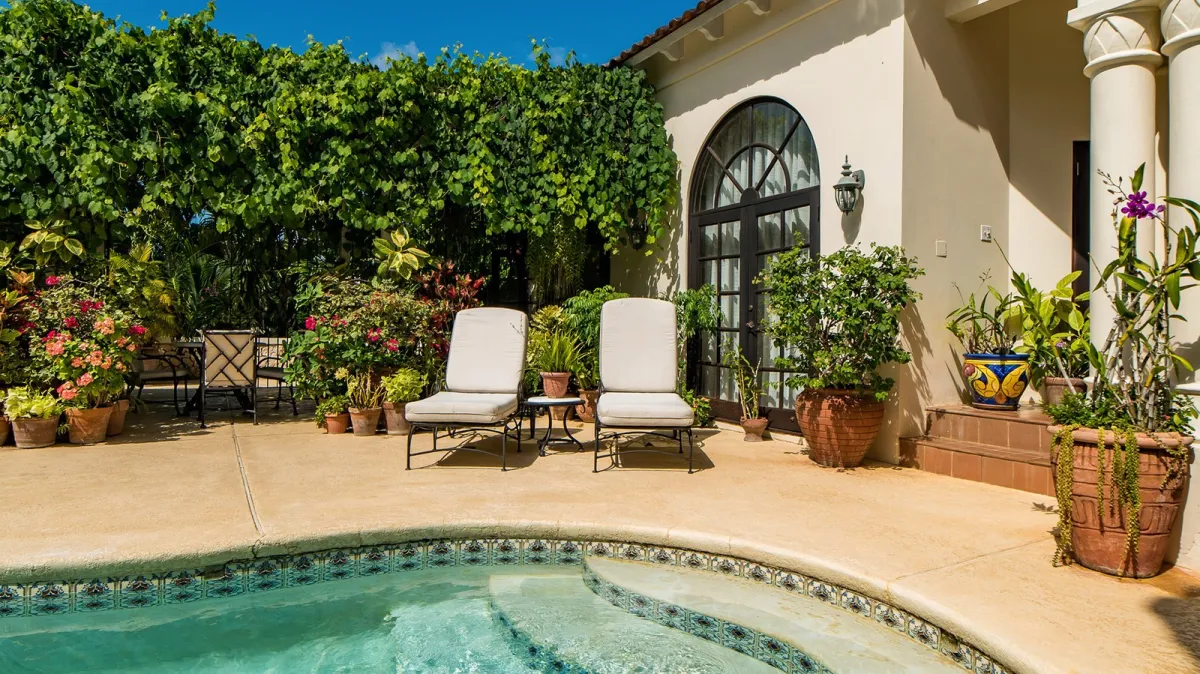 The two-story, white concrete structure is topped with a terra-cotta tile roof and sits on 1.3 landscaped acres, with ocean views. It has four bedrooms and four and a half bathrooms, as well as separate staff or guest quarters and a large central courtyard with a pool, hot tub, and areas for lounging and dining.