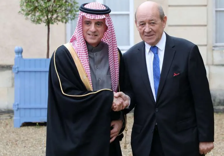 Saudi Foreign Affairs Minister Adel Al-Jubeir is welcomed by his French counterpart Jean Yves Le Drian, at La Celle-Saint-Cloud, December 13, Photo credit: LUDOVIC MARIN/AFP