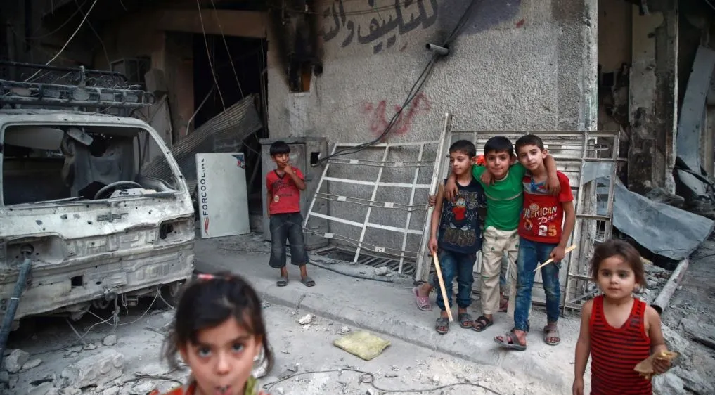 Children are seen near rubble of damaged buildings in the eastern Damascus suburb of Ghouta, Syria, July 17, 2017, Reuters