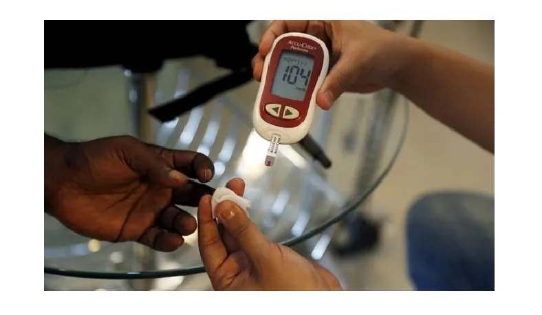 A paramedic (R) checks the blood sugar level of a patient at SS Diabetes Care clinic in Jakarta, Indonesia, April 22, 2016. REUTERS/Beawiharta