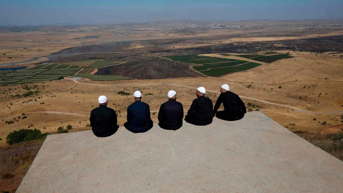 Druze men at the Israeli-annexed Golan Heights look out across Quneitra. AFP