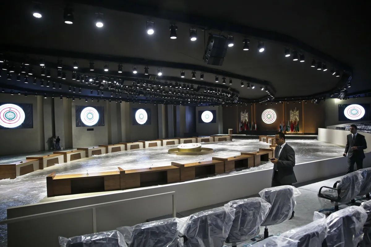 In this Monday, Jan. 14, 2019 photo, Lebanese security officers check a hall where an Arab economic development summit will be held, in Beirut, Lebanon. (AP Photo/Hussein Malla)