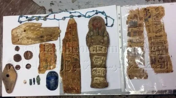 The pieces include a 24-cm-long Oscapet, made of burnt clay and wrapped in linen with hieroglyphic inscriptions, three pieces of pharaonic coffins inscribed with hieroglyphic inscriptions, a blue and green phoenix necklace, three Pharaonic pharaonic amulets, a small scarab Made of ivory, medium-sized scarab with writings in Hierotica, five coins dating back to the Greco-Roman era, an incised lamp with the face of the Hathor god, dating back to the Pharaonic era, and nine pieces of colored pottery with ambiguous drawings.