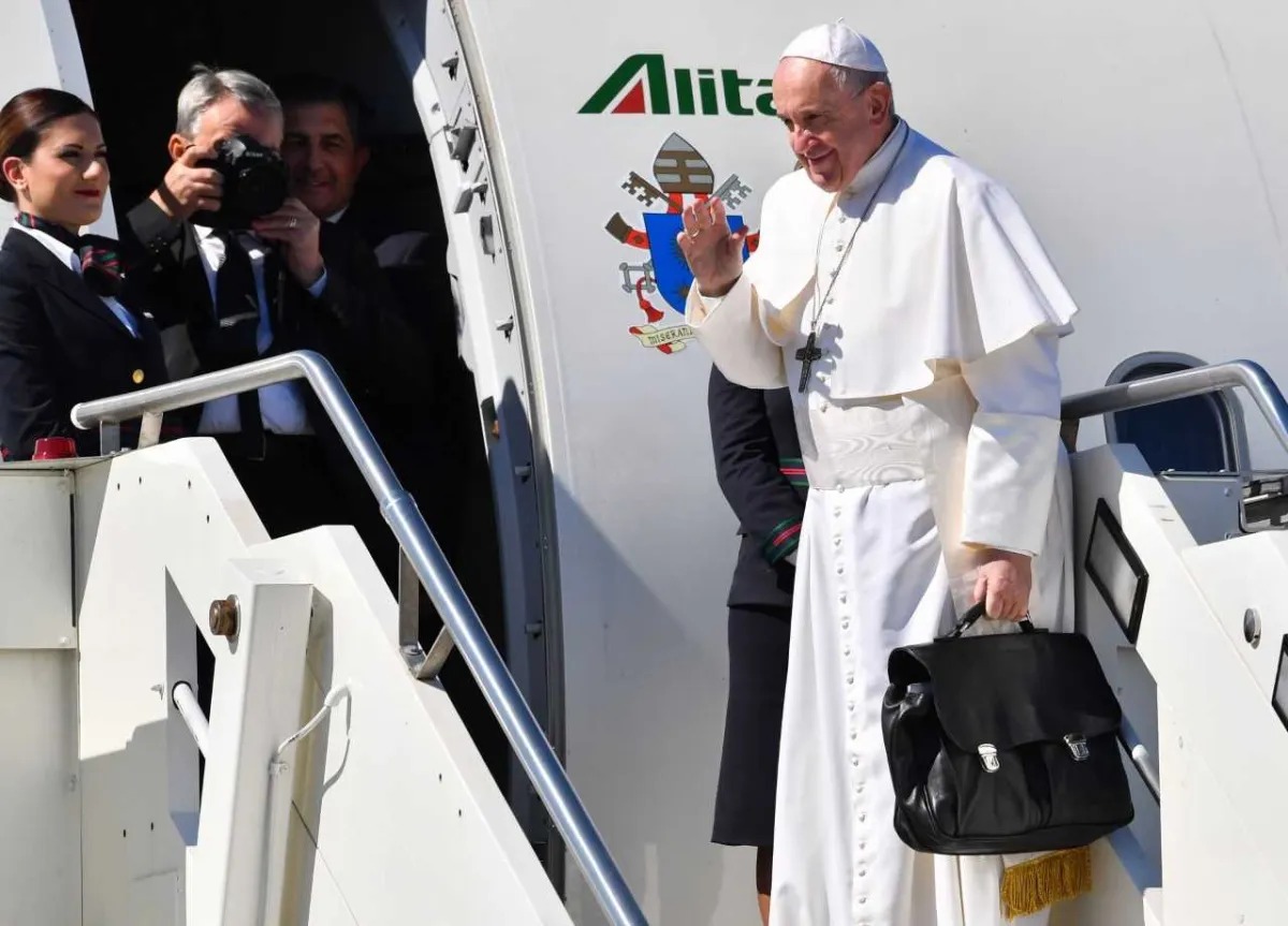 Pope Francis waves as he boards a plane upon his departure for a two-day trip to Morocco on March 30, 2019 at Rome's Fiumicino airport. (Photo by Andreas SOLARO / AFP)
