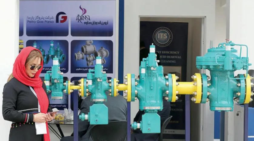 An Iranian employee looks at her phone during the the 24th International Oil, Gas, Petrochemical International Exhibition in Tehran, Iran, 01 May 2019. EPA/ABEDIN TAHERKENAREH