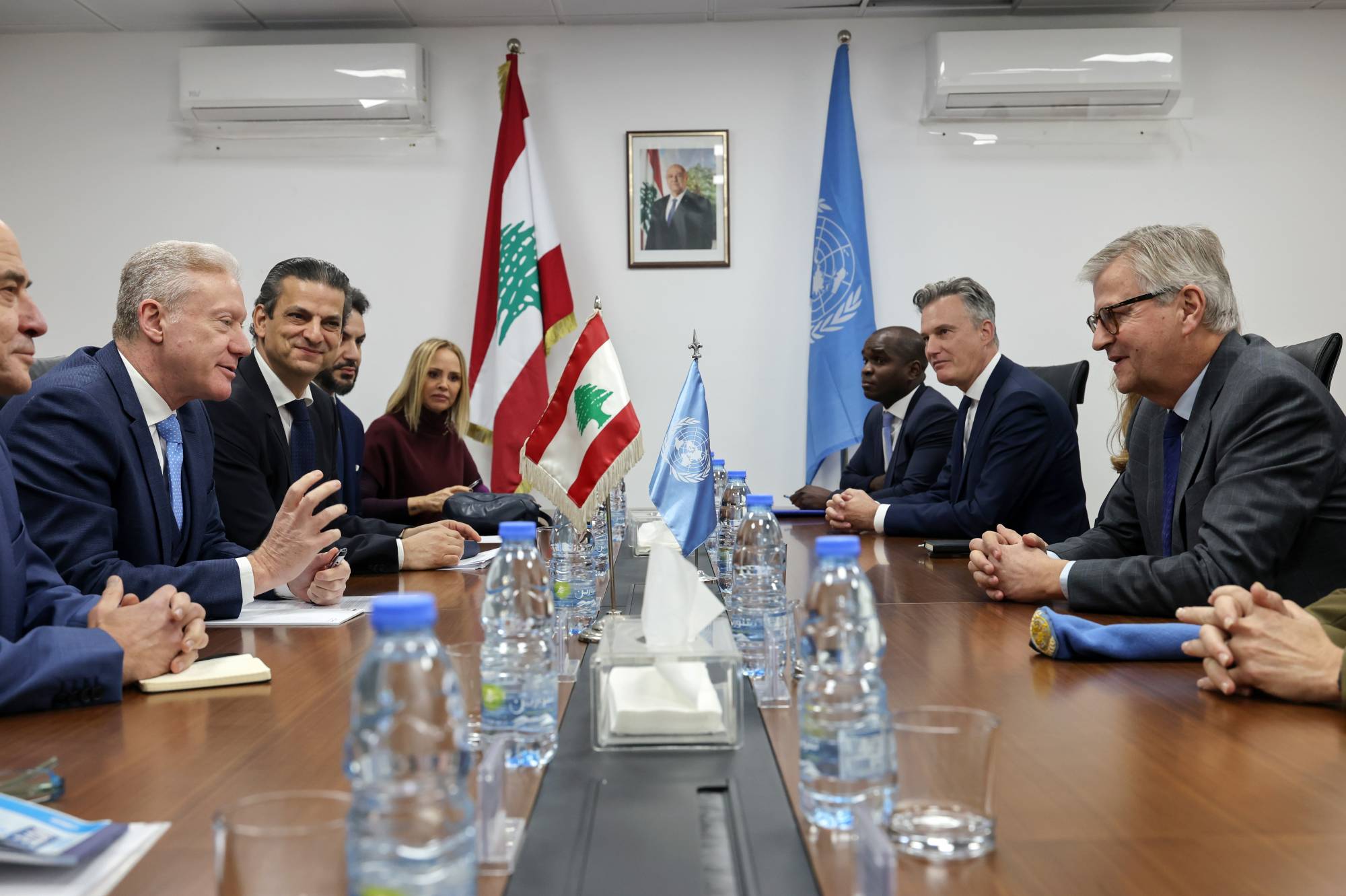 Lebanese Minister of Foreign Affairs and Emigrants Youssef Raggi (L) meets UN Under-Secretary-General for Peace Operations Jean-Pierre Lacroix (R) at the Lebanese Foreign Ministry in Beirut, Lebanon, 07 January 2026. Lacroix is on an official visit to meet Lebanon's leaders. EPA/WAEL HAMZEH