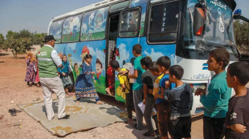 Displaced Syrian children in front of a bus taking them to classrooms near Idlib (AFP)