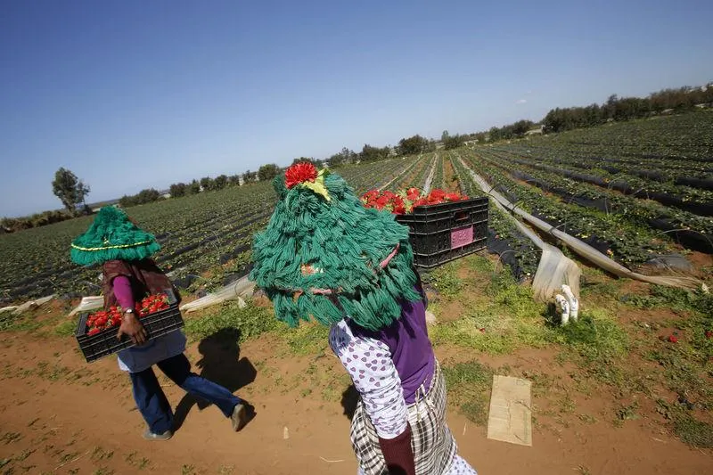 Farmers carry containers of strawberries, to be exported, after picking them in a field in the town of Moulay Bousselham in Kenitra province, file. REUTERS/Youssef Boudlal