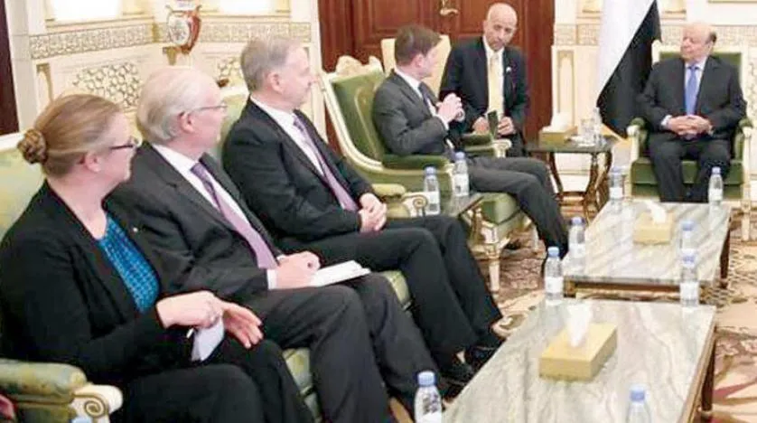 Yemeni President Abd Rabbu Mansour Hadi discussed with US Under Secretary of State for Political Affairs David Hale and his accompanying delegation in Riyadh Iranian interference in the region and issues of combating terrorism.