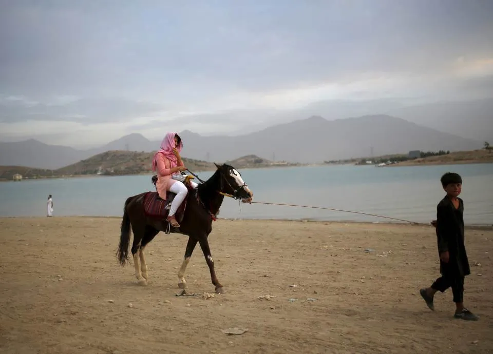 A woman enjoys a horse ride along Qargha lake, in Kabul, Afghanistan July 21, 2015. REUTERS/Ahmad Masood