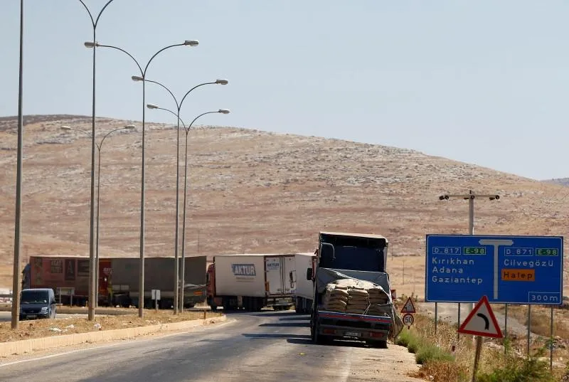 Commercial Turkish trucks wait to cross to Syria near the Cilvegozu border gate, located opposite the Syrian commercial crossing point Bab al-Hawa in Reyhanli, Hatay province, Turkey, September 16, 2016. REUTERS/Osman Orsal