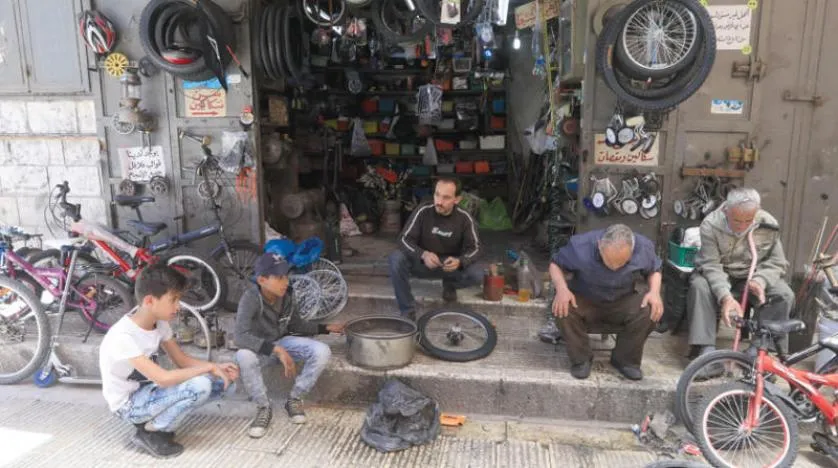 A Palestinian man prays while sitting in front of his small workshop in Nablus on Friday, May 8, 2020 (EPA)