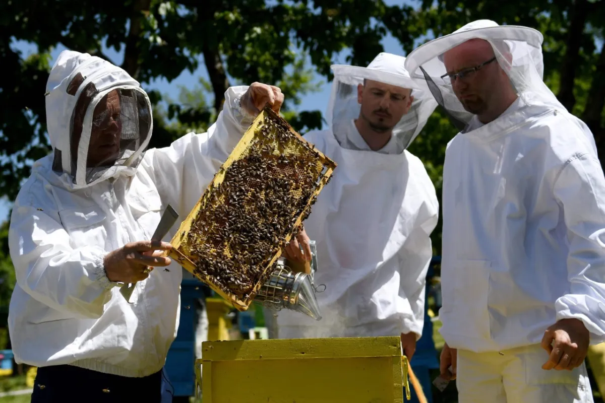 Beekeeper handles a beehive's frame covered in bees at the Morava farm, in the village of Plasa, near the city of Korca, Albania on May 13, 2020. (AFP Photo).