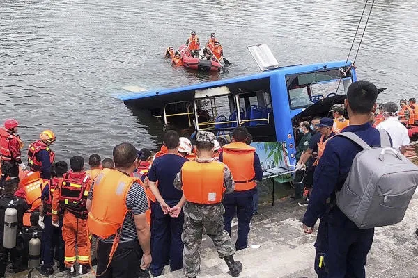 In this photo released by Xinhua News Agency, rescuers watch as a bus that fell into a lake is recovered in the Xixiu District of Anshun, southwestern China's Guizhou Province, Tuesday, July 7, 2020. Authorities say dozens were killed Tuesday when a bus ran through a roadside fence and plunged into a lake in the southwestern Chinese city. (Long Rui/Xinhua via AP)