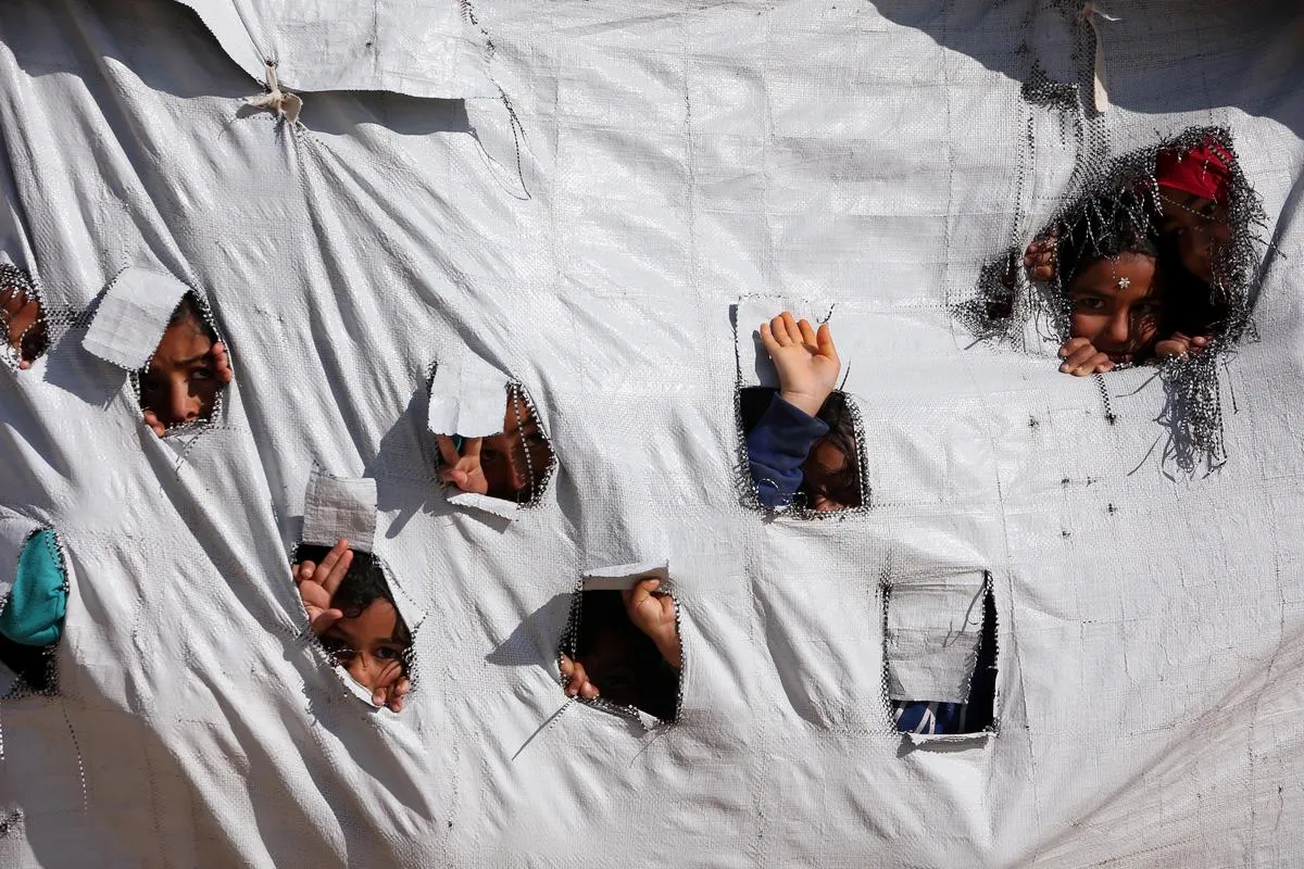 Children look through holes in a tent at al-Hol displacement camp in Hasaka governorate, Syria April 2, 2019. Picture taken April 2, 2019. REUTERS/Ali Hashisho
