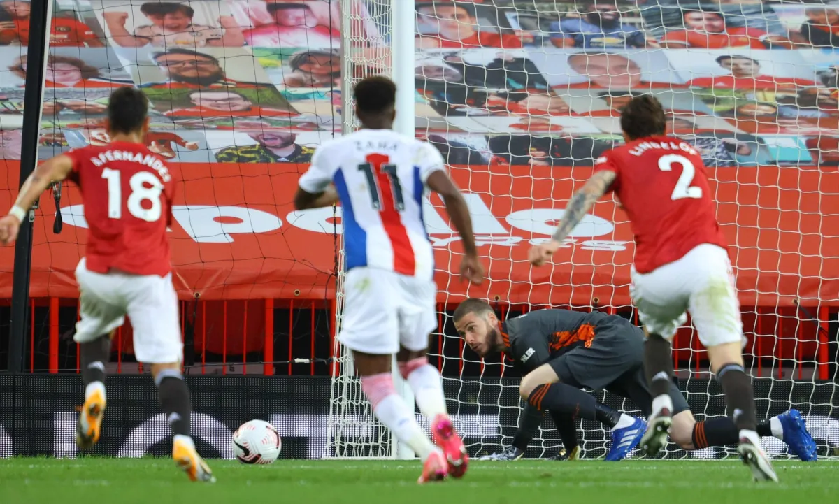 Manchester United’s David de Gea saves Jordan Ayew’s initial penalty only to be found to have encroached by a VAR check. Wilfried Zaha scored the retake.