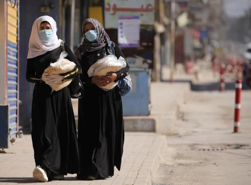 Women hold stacks of bread as they walk along an empty street, as restrictions are imposed as measure to prevent the spread of the coronavirus disease (COVID-19) in Qamishli, Syria March 23, 2020. REUTERS/Rodi Said