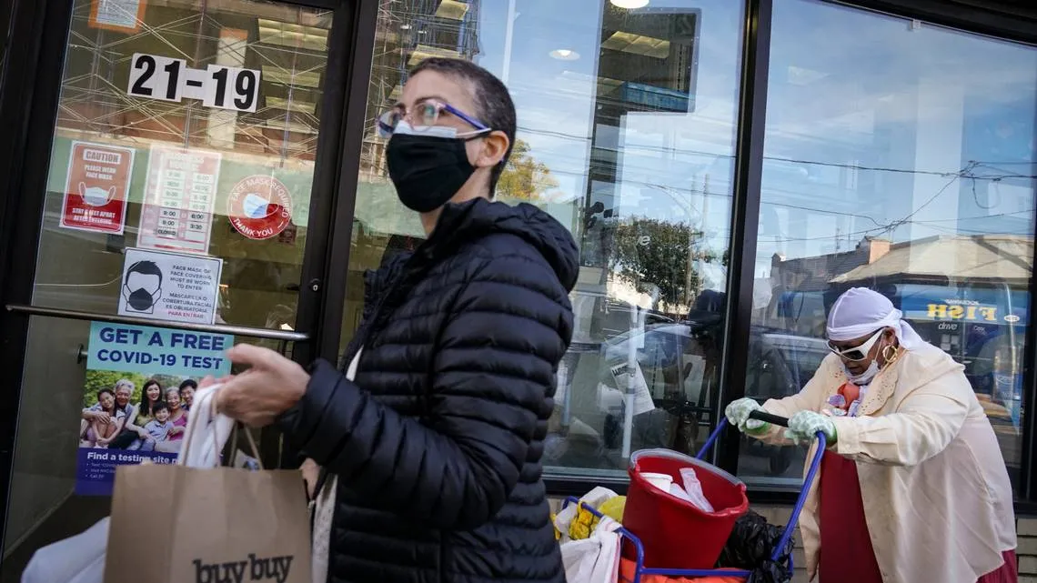 Pedestrians in protective masks pass a storefront on Thursday, Oct. 15, 2020, as restrictions on operations are imposed due to an increase in COVID-19 infections in the Far Rockaway neighborhood of the borough of Queens in New York. (AP Photo/John Minchillo)