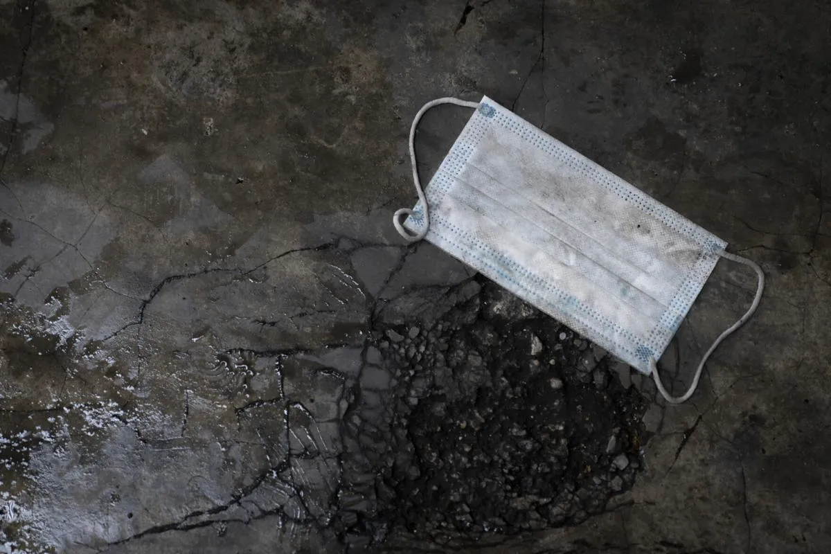 A face mask is seen on a floor as health ministry staff collect samples for coronavirus testing from residents at an urban area in Bandar Utama, outskirt of Kuala Lumpur, Malaysia Thursday, Oct. 22, 2020. (AP Photo/Vincent Thian)