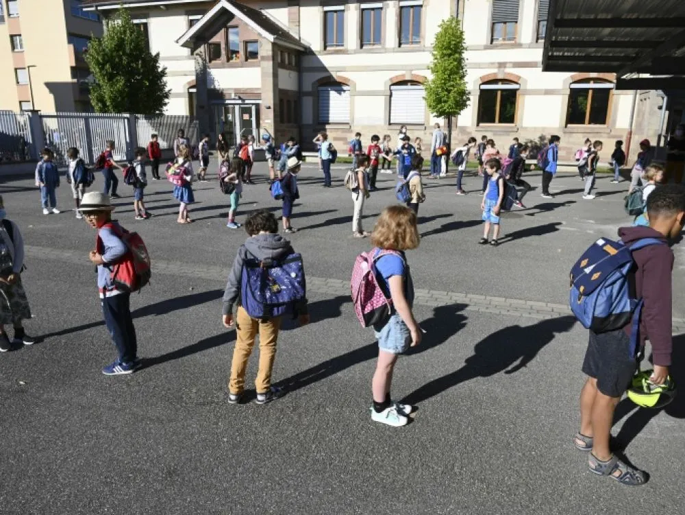 Children queue to enter their classrooms at the Ziegelau elementary school in Strasbourg, eastern France, as primary and middle schools reopen on June 22, 2020. AFP - FREDERICK FLORIN