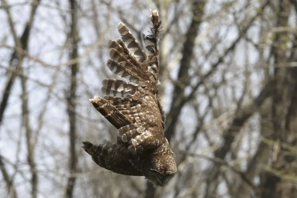 In this April 6, 2019 photo provided by Bill Hulsebus a barred owl is seen caught in fishing line in a tree at the Springfield Conservation Nature Center in Springfield, Mo. (Bill Hulsebus via AP)