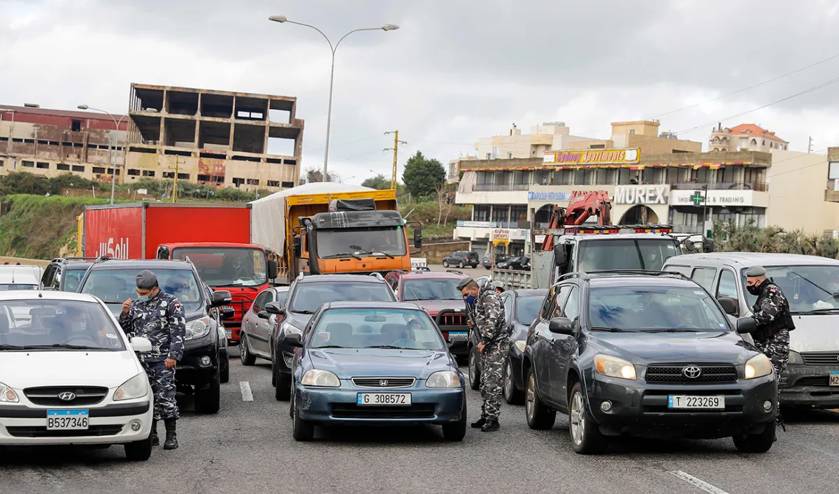 Members of the Lebanese security forces check citizens' documents at a COVID-19 checkpoint near the coastal town of Safra on the Tripoli-Beirut main highway on January 19, 2021, as Lebanon enters a second week under lockdown aimed at preventing the country's creaking healthcare system from collapsing. (Photo by JOSEPH EID / AFP)