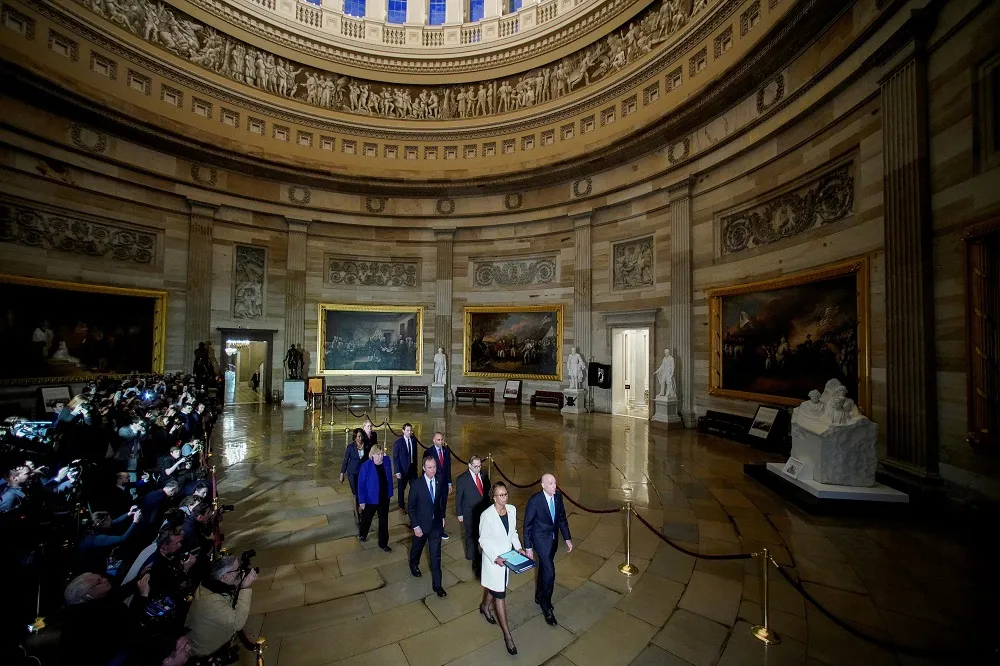 In a solemn procession, the nine House impeachment managers silently walked the article through the same ornate halls of Congress overrun by Trump supporters on January 6 and delivered it to the Senate.