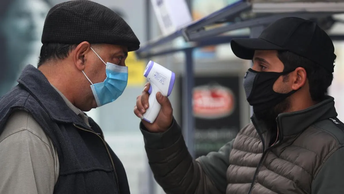 A shopper has his temperature checked outside a supermarket in the Iraqi capital Baghdad on December 18, 2020. AFP