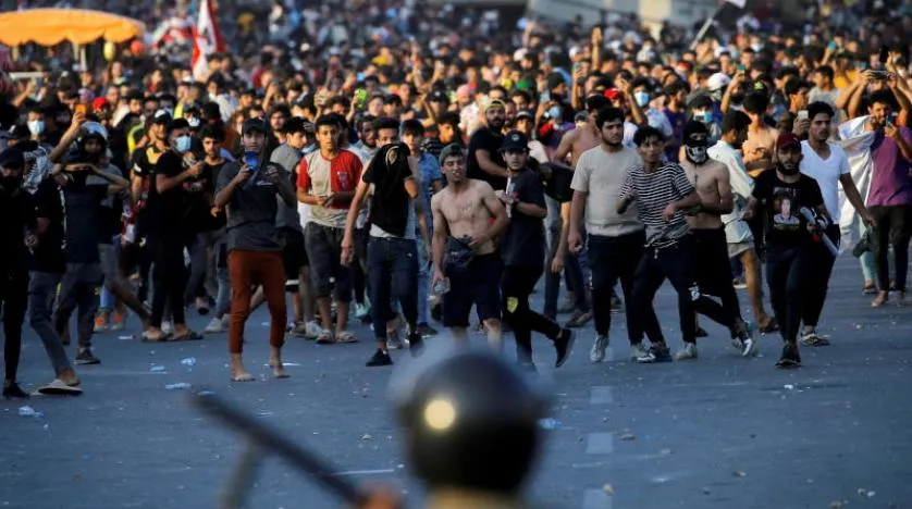 Demonstrators face security forces during an anti-government protest in Baghdad, Iraq May 25, 2021. REUTERS/Thaier Al-Sudani/File Photo