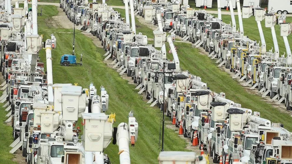 About 250 electrical utility trucks are lined up at Duke Energy's staging location in The Villages of Sumter County on Tuesday, July 6, 2021. (Stephen M. Dowell/Orlando Sentinel via AP)