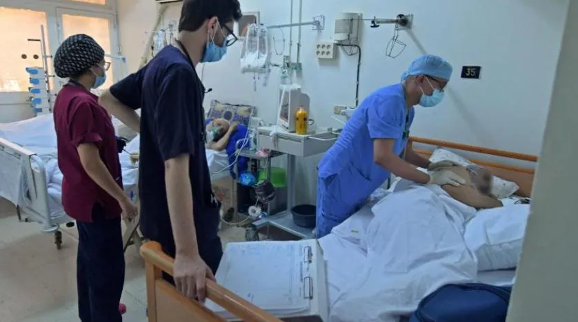 Tunisian chief physician Slah Souii (R) and his medical team attend a patient infected with COVID-19 the Aghlabide hospital in the east-central city of Kairouan on July 4, 2021. (Photo by FETHI BELAID / AFP)