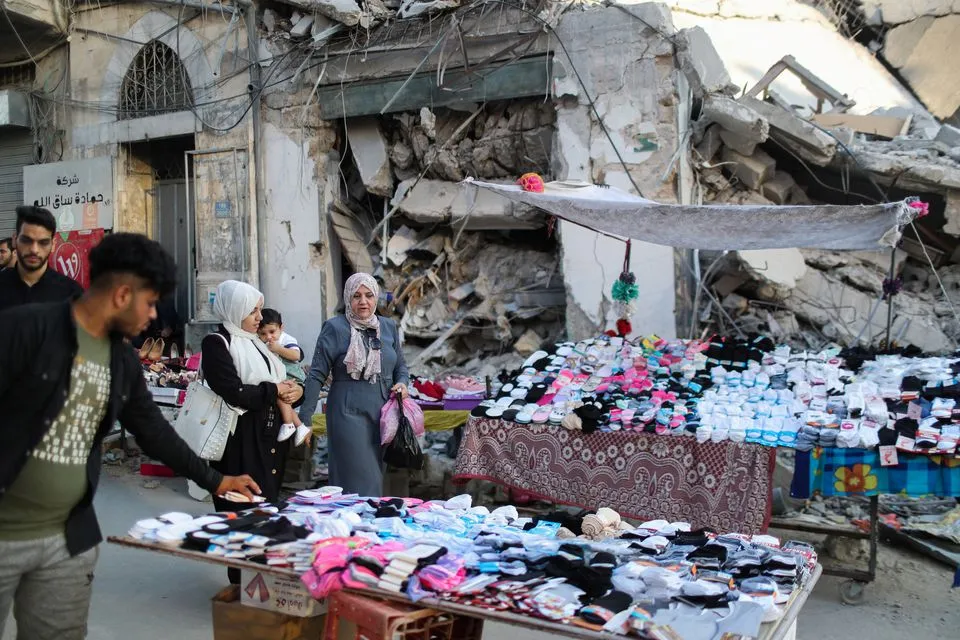At a street stall in Gaza's busy Rimal neighbourhood, Mohammad Al-Qassas laments the destruction of his shoe store in the fighting as he sells goods that he salvaged from the rubble.