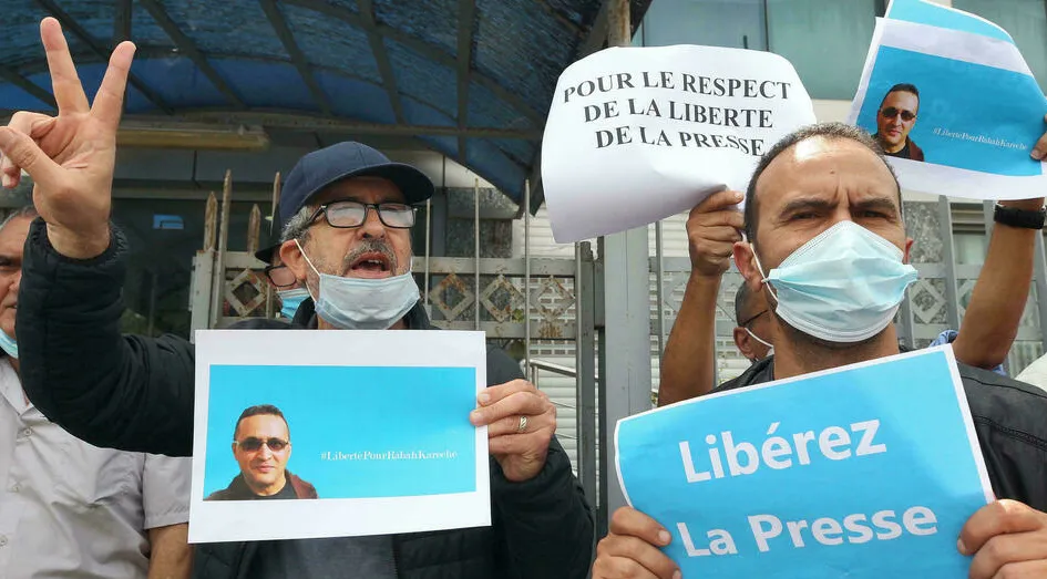 A demonstration outside the newspaper Liberte in Algiers on April 25, 2021 calling for the Kareche's release - AFP
