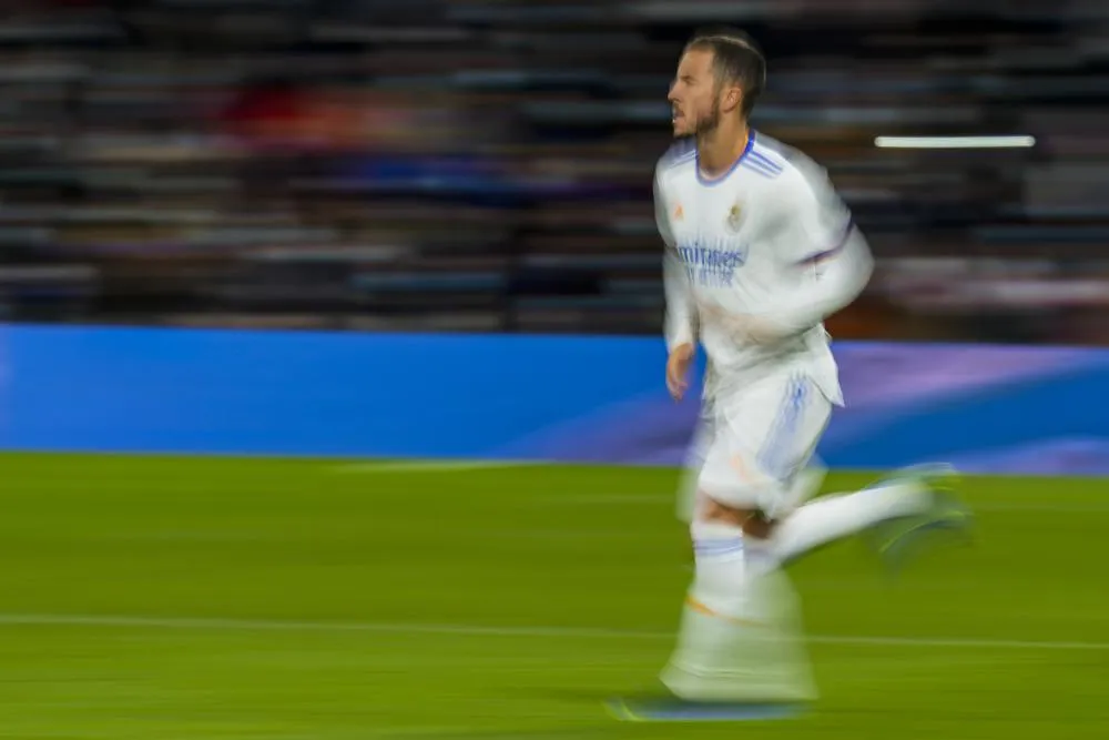 In this photo taken with a slow shutter speed Real Madrid's Eden Hazard runs during a Spanish LaLiga match between Real Madrid and Rayo Vallecano at the Bernabeu stadium in Madrid, Spain, Saturday, Nov. 6, 2021. (AP)