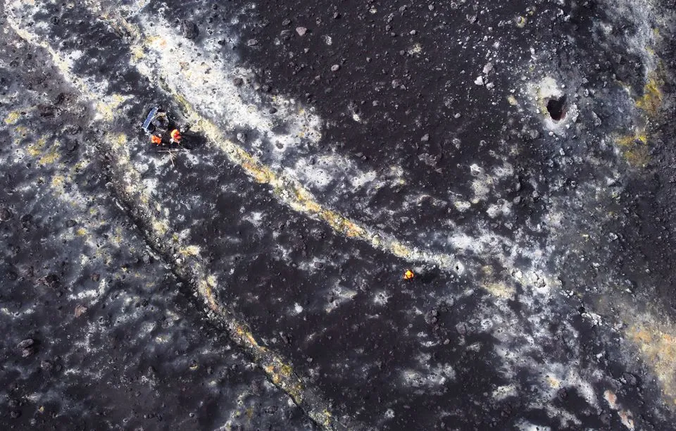 Members of the INVOLCAN technical team take measurements next to the crater of the Cumbre Vieja volcano, in Cabeza de Vaca, on the Canary Island of La Palma, Spain, January 21, 2022. Picture taken January 21, 2022. Picture taken with a drone. (Reuters)
