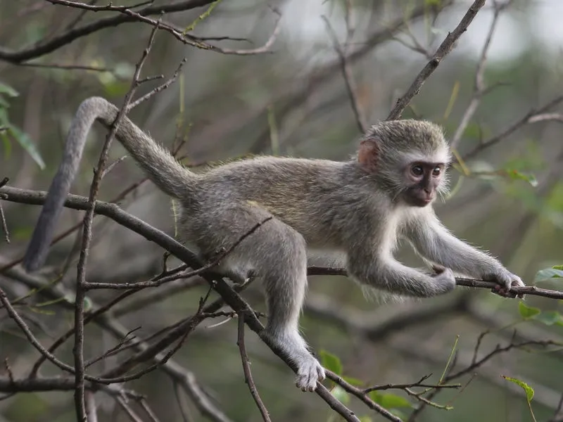 In this photo taken Monday, Feb. 15, 2016 a vervet monkey climbs in a tree at the Treetop Lodge in the Hluhluwe–Imfolozi Park in the KwaZula province, South Africa. Denis Farrell/AP