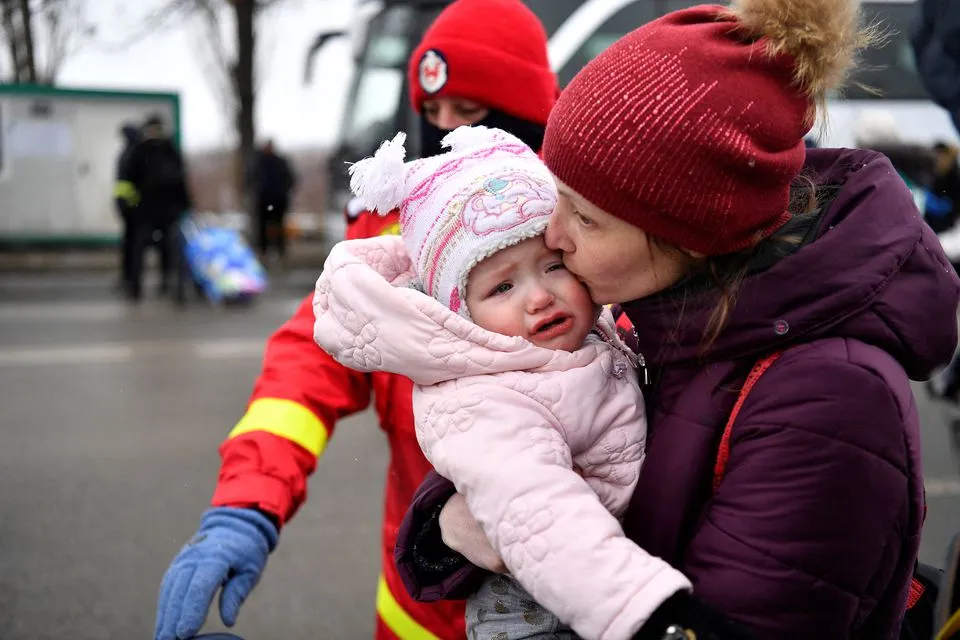 In Romania, at the Siret border crossing with Ukraine, volunteers in reflective jackets welcomed Ukrainian mothers carrying backpacks, pushing prams or holding toddlers as they left the crossing, with the wind blowing and the snow falling.