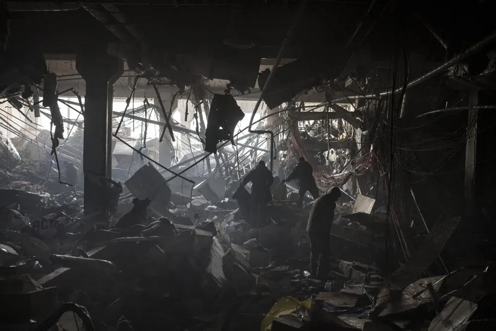 Ukrainian soldiers and firefighters search for people under debris inside a shopping center after shelling, in Kyiv, Ukraine, Monday, March 21, 2022. (AP)
