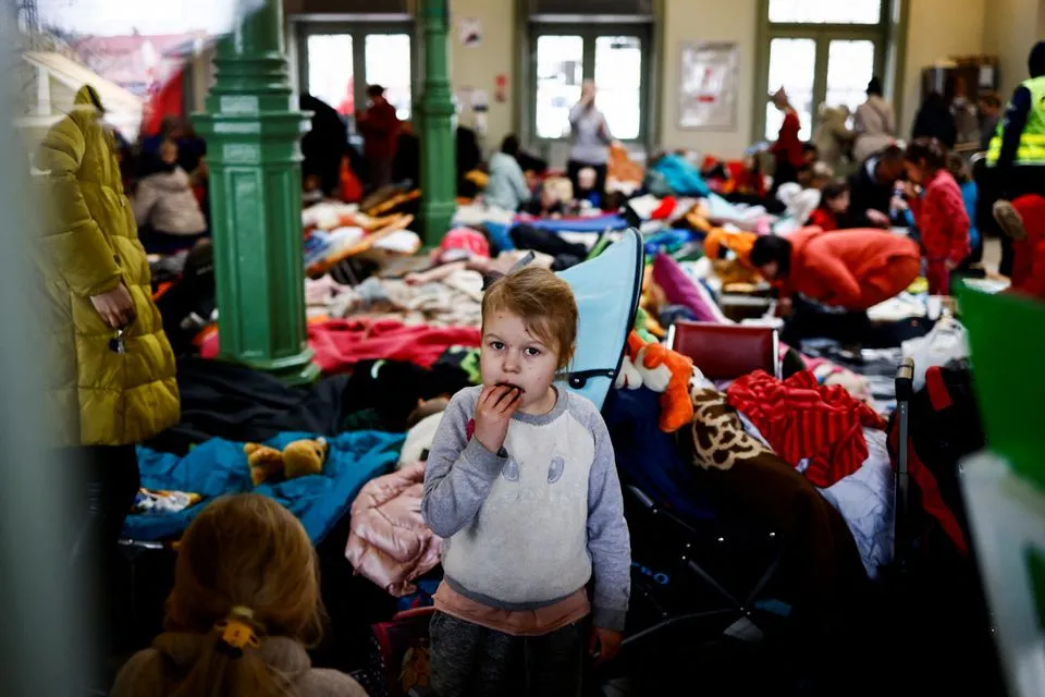 A child eats a cookie as she stands in a temporary accommodation for refugees at the train station, after fleeing Russian invasion of Ukraine, in Przemysl, Poland, March 7, 2022. REUTERS/Yara Nardi/File Photo