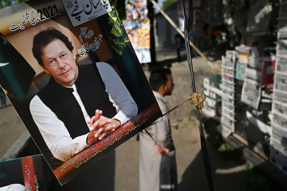 A resident stands beside a picture of Pakistan's Prime Minister Imran Khan as he looks at the morning newspapers displayed for sale at a roadside stall in Islamabad, Pakistan, April 4, 2022. (AFP)