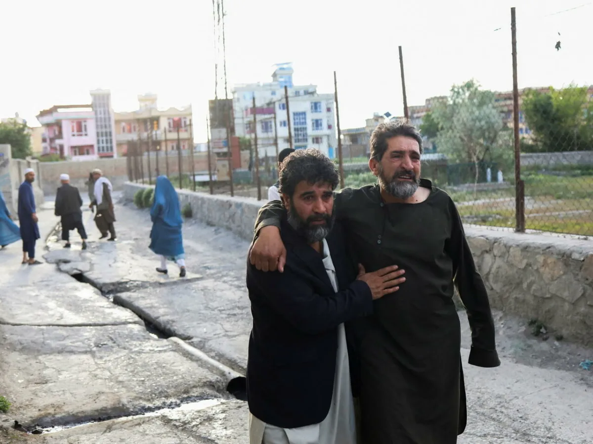 Afghan men flee near the site of explosions at Khalifa Sahib Mosque in Kabul, Afghanistan on April 29 2022. © Ali Khara, Reuters