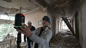 He plants his laser scanner, a sort of tripod with a pivoting head, in a strategic corner of the severely damaged building.