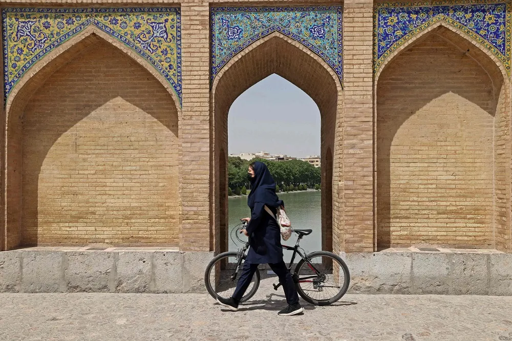 An Iranian woman crosses the iconic Khaju Bridge over the Zayandeh Rud river in Isfahan, on May 16, 2022 . (AFP)