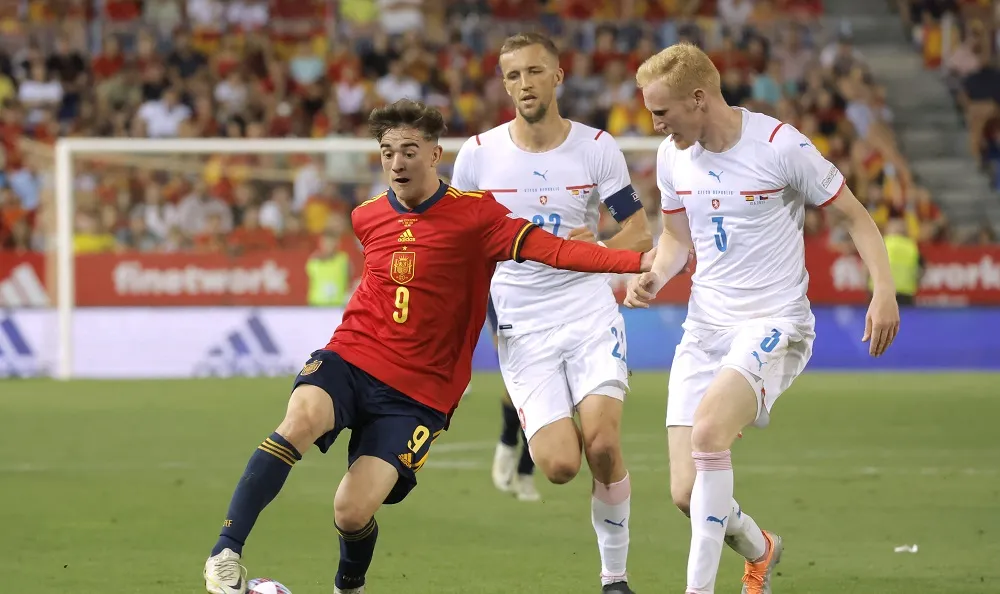 Football - UEFA Nations League - Group B - Spain v Czech Republic - La Rosaleda Stadium, Malaga, Spain - June 12, 2022 Spain's Gavi in action with Czech Republic's Vaclav Jemelka. (Reuters)